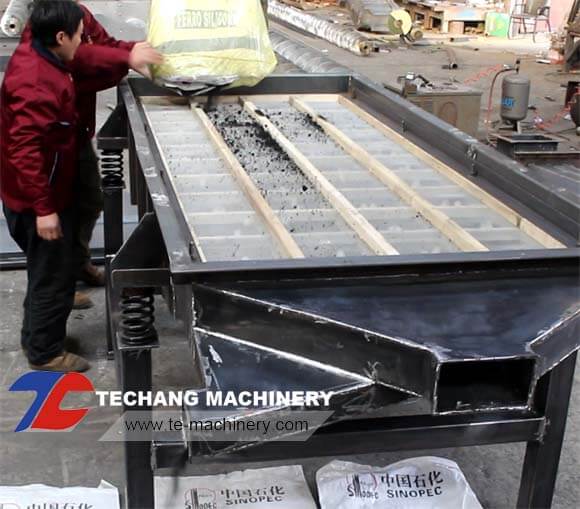 This week we received the sample of one bag 100 kg sands from one of Omani customer, the customer hope we make a solution for vibrating screen product according to testing the samples, this black sand is used in foundry factory, but it is different from Chinese sand in foundry factory. Yesterday we made the test successfully according to the customer’s technical requirements by similar vibrating screen and exact screen size. Our engineer modified the old solution of reducing the sieving area after this test, because we found the sand is in good sieving efficiency in the test, thanks for the customer’s trust of sending the sample to us, it help us to know more about the materials greatly and make the optimal solution.